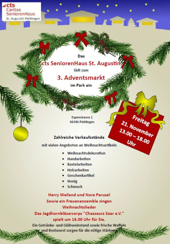 Das Caritas SeniorenHaus St. Augustin lädt ganz herzlich zum 3. Adventsmarkt am 21. November in den Park der Einrichtung in der Espenstraße 1 ein. Zahlreiche Verkaufsstände erwarten die Besucher in der Zeit von 13.00 bis 18.00 Uhr in weihnachtlicher Atmosphäre. Natürlich ist wie immer für das leibliche Wohl bestens gesorgt.